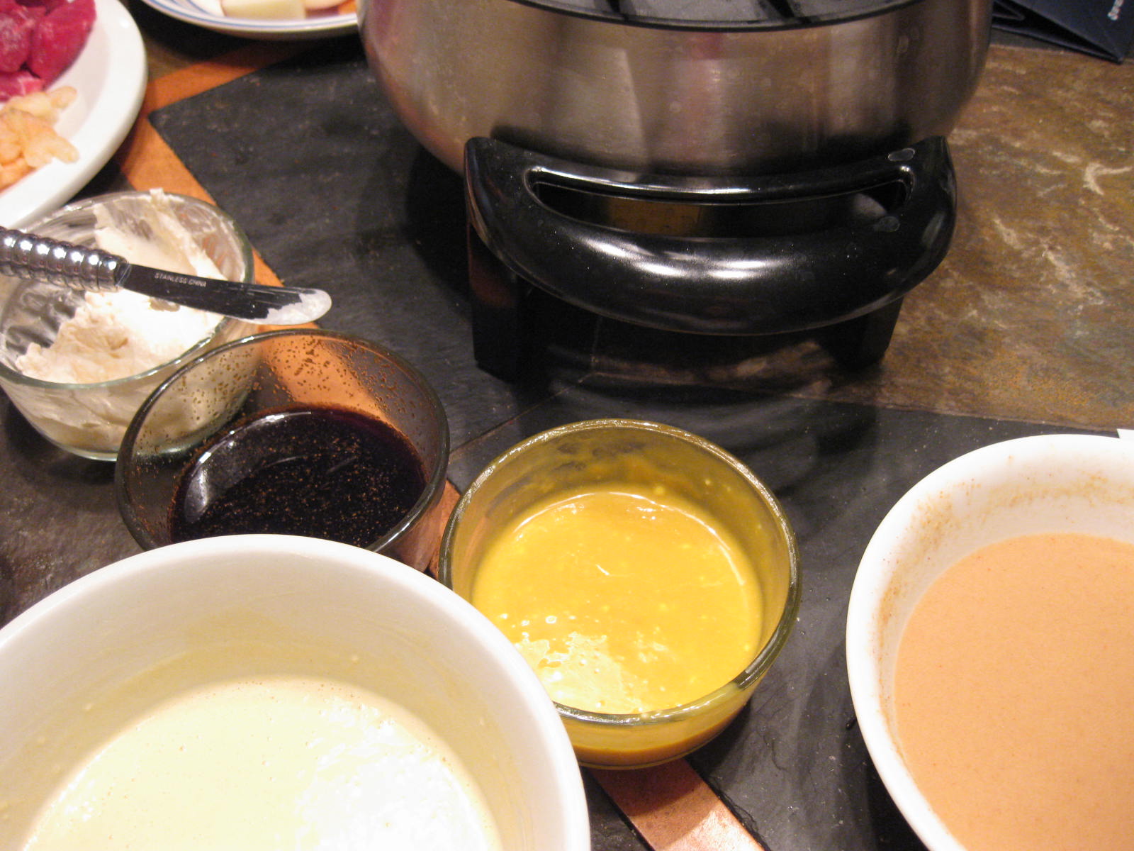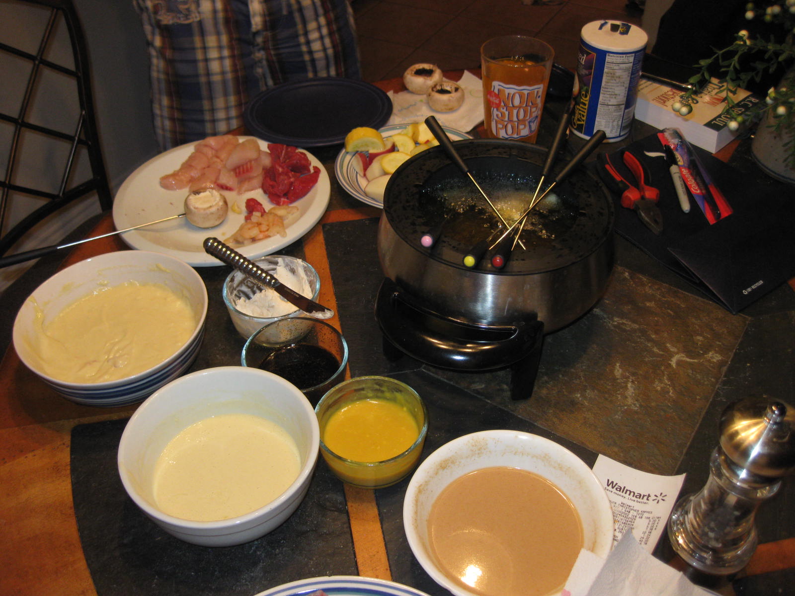 3. Dip meats and veggies in desired batter and then in fondue pot. Leave in until cooked through.
