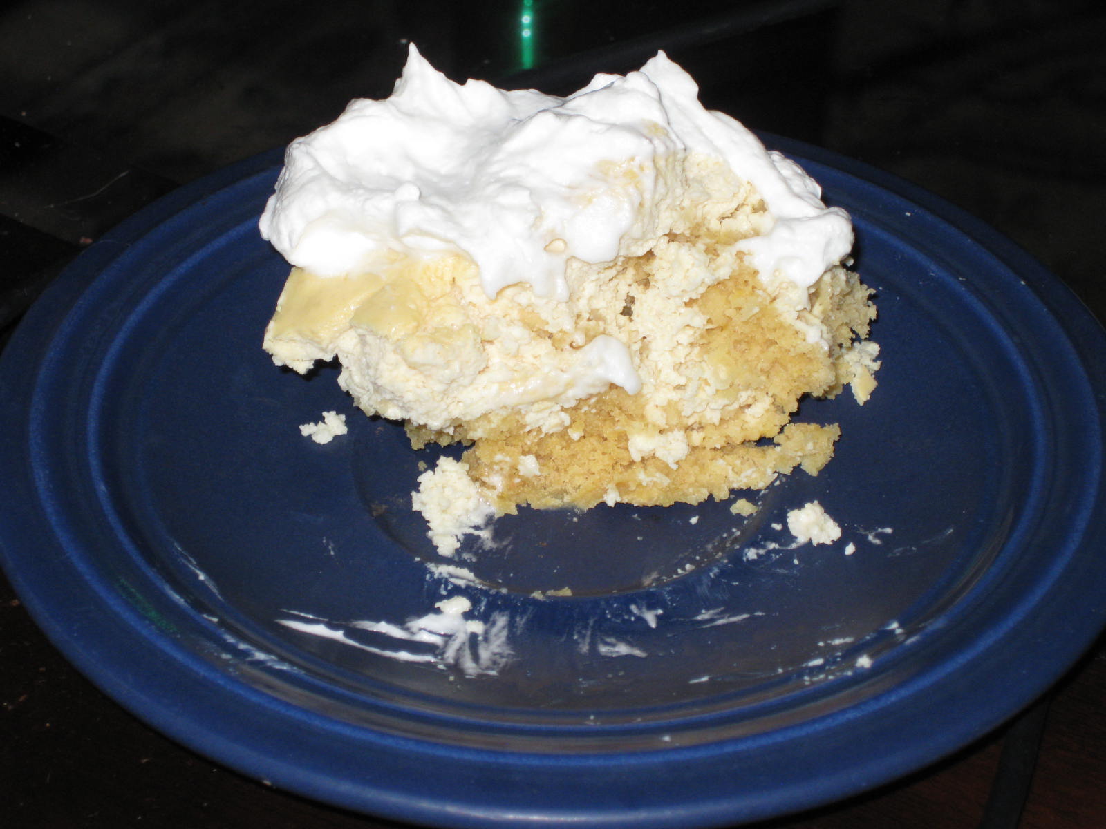 - BEAT cream cheese and remaining brown sugar, and splenda with mixer. Add reserved cake mix, remaining eggbeaters and lemon juice; beat 1 min. Blend in soy milk. (Batter will be very thin.) Pour into crust.