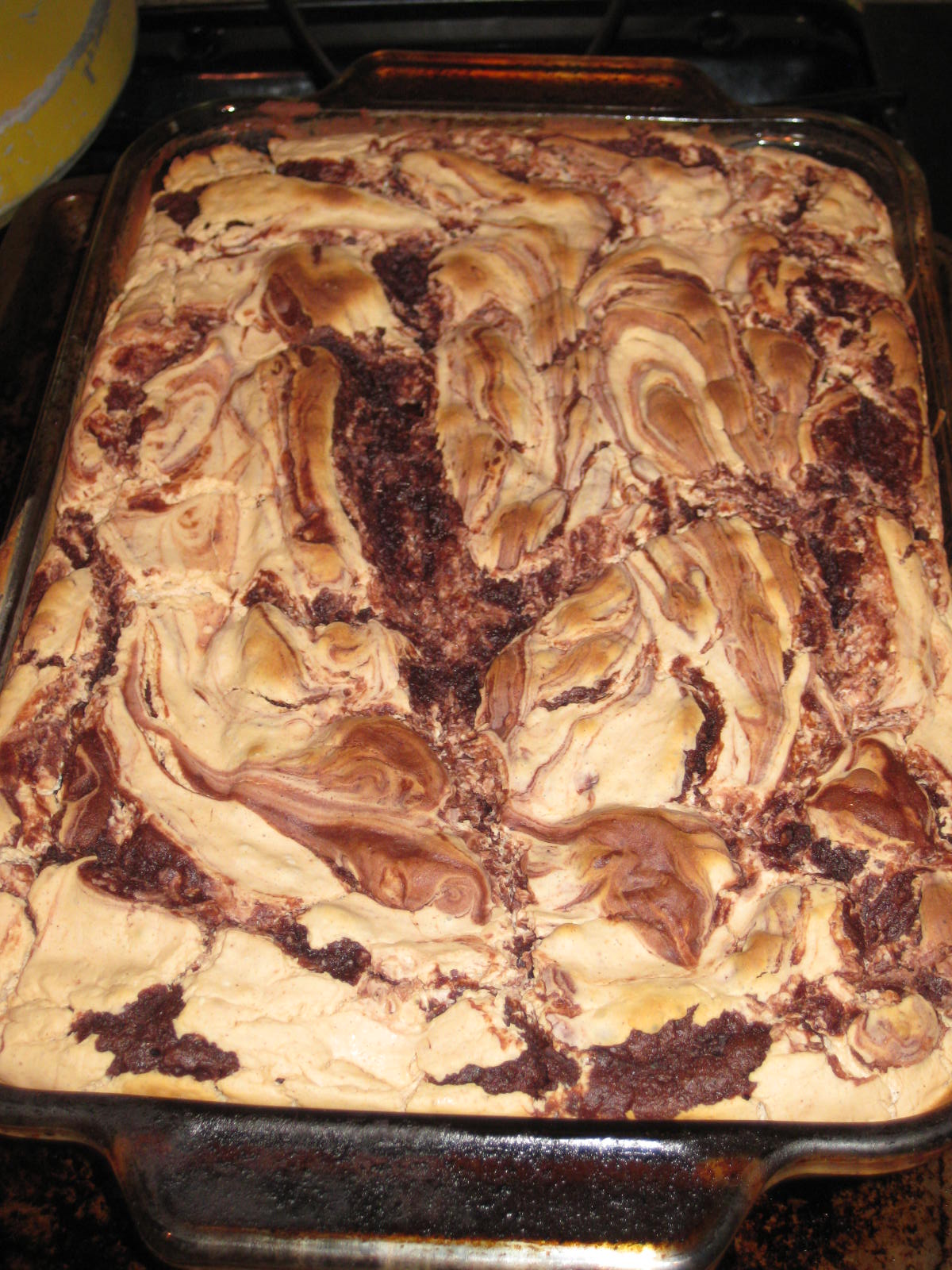 - Mix remaining ingredients together and drop by spoonfuls over batter and swirl with a knife to make a swirly design.