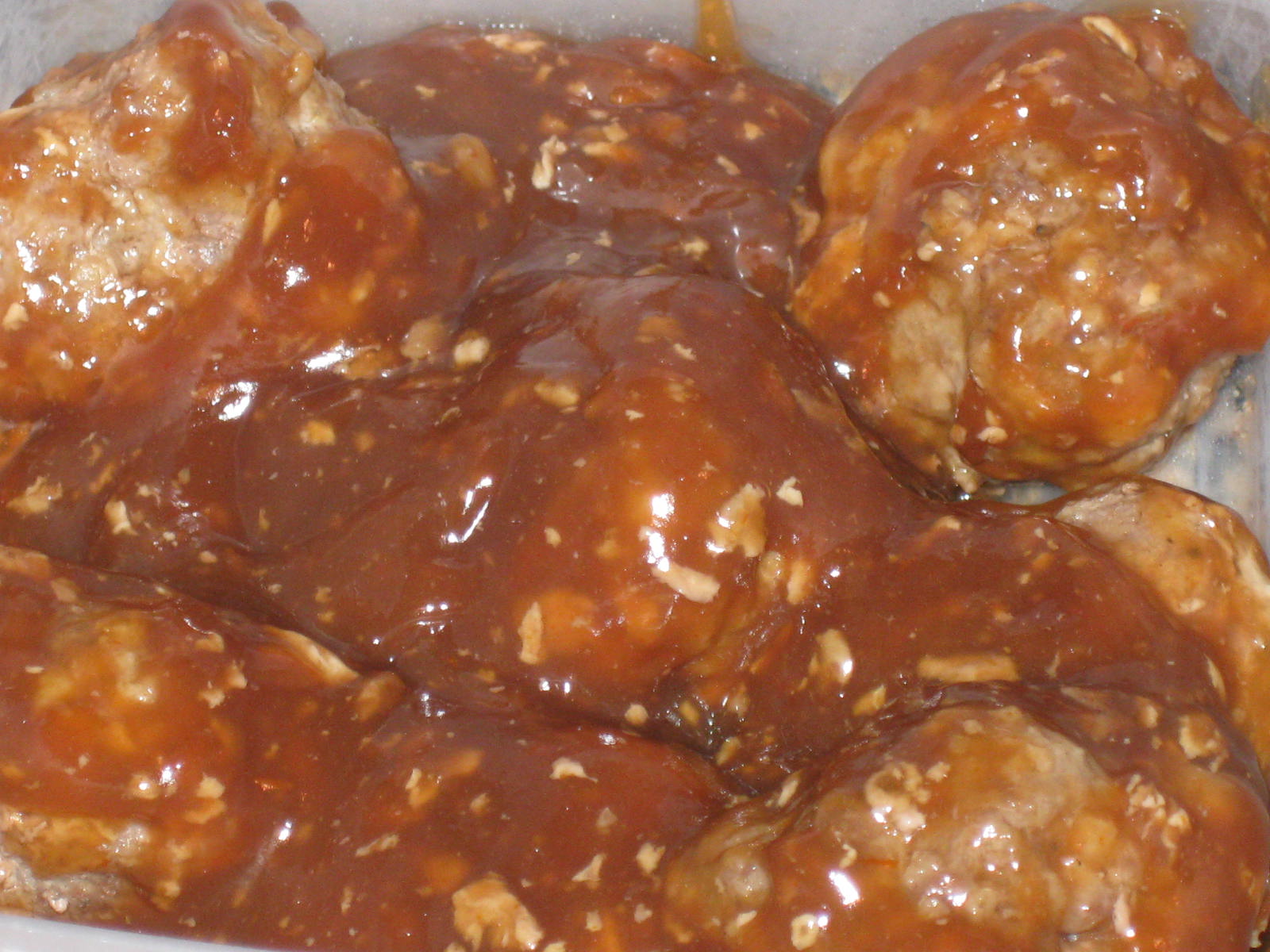 - When meatballs are done, place them in a deep skillet. Pour the sauce over the meatballs, and allow sauce to thicken. Continue to heat until the sauce just starts to bubble.