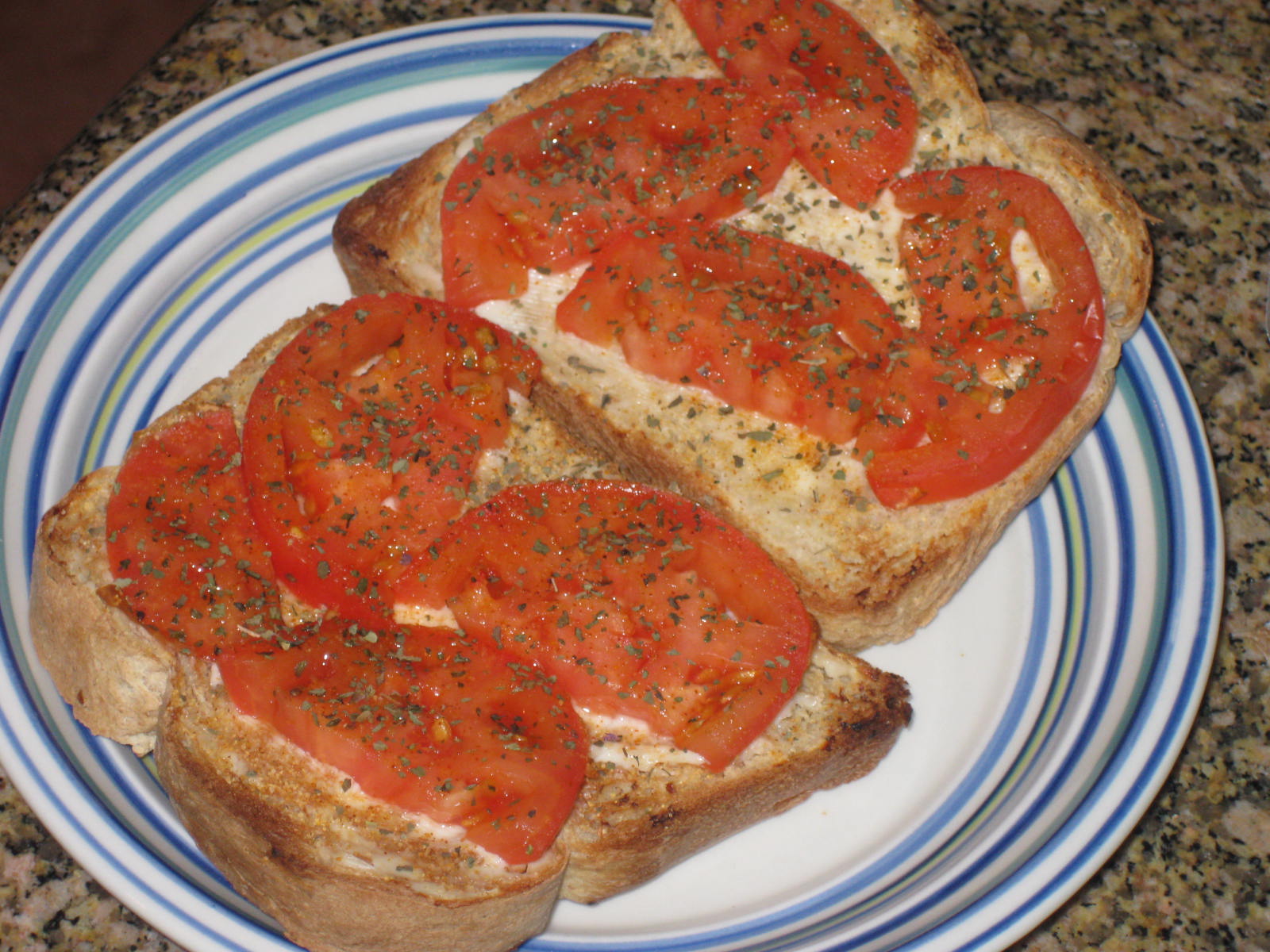 - Spread 1/2 wedge of Laughing Cow on each slice of toast. Top with tomato slices, basil, and salt.