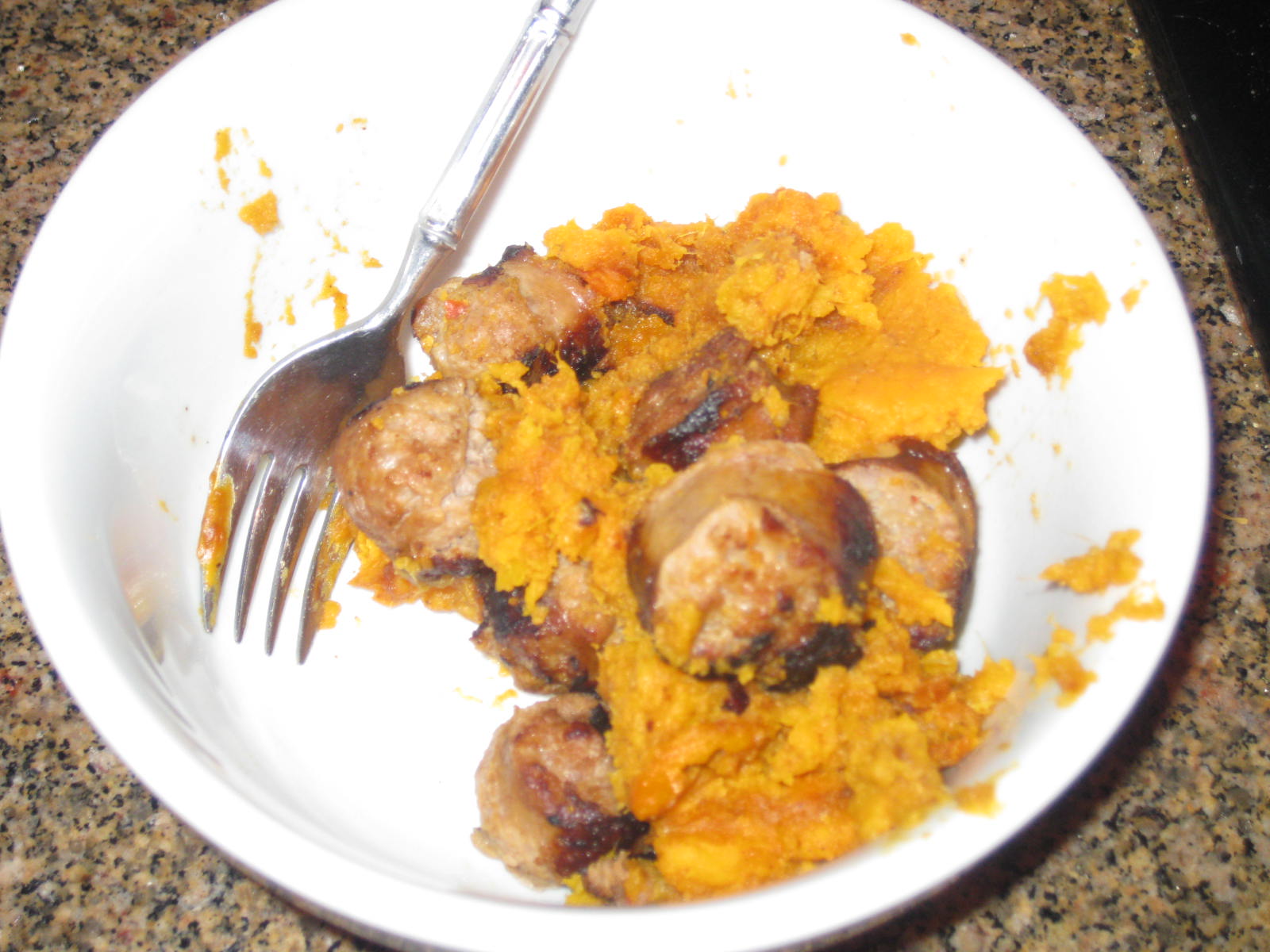 - Spoon the potatoes in the bottom of a 8×8 or loaf pan. Top with sausage and cook at 350 for 30-35 minutes.