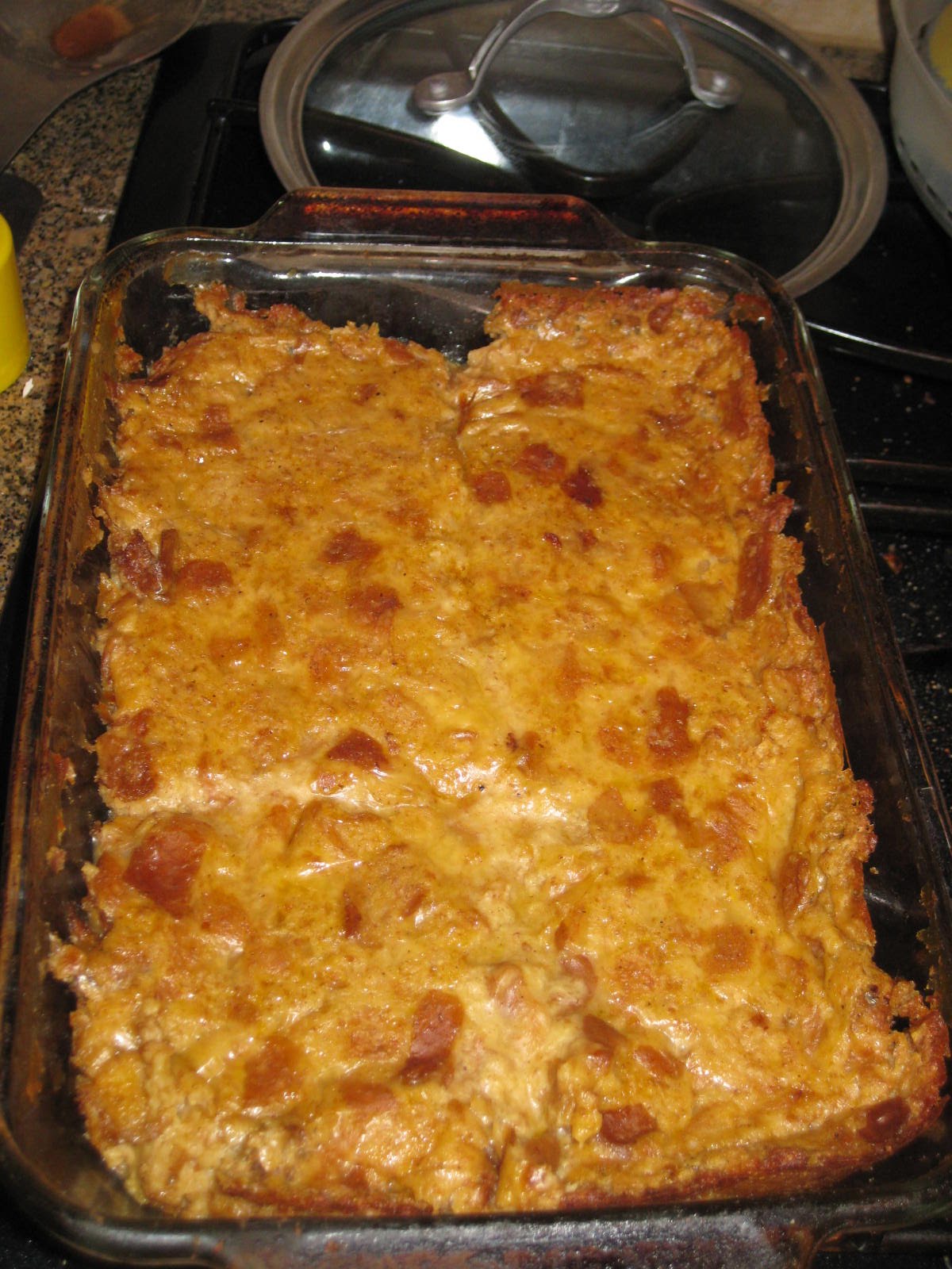 Kristen’s husband’s stuffing recipe without celery 😉 Next time, I might reduce the liquid ingredients, because mine was not very firm, and I’m assuming it was nixing the celery that made it too moist. OR maybe I could have cooked it longer. I also might add a pound of italian turkey sausage next time 🙂