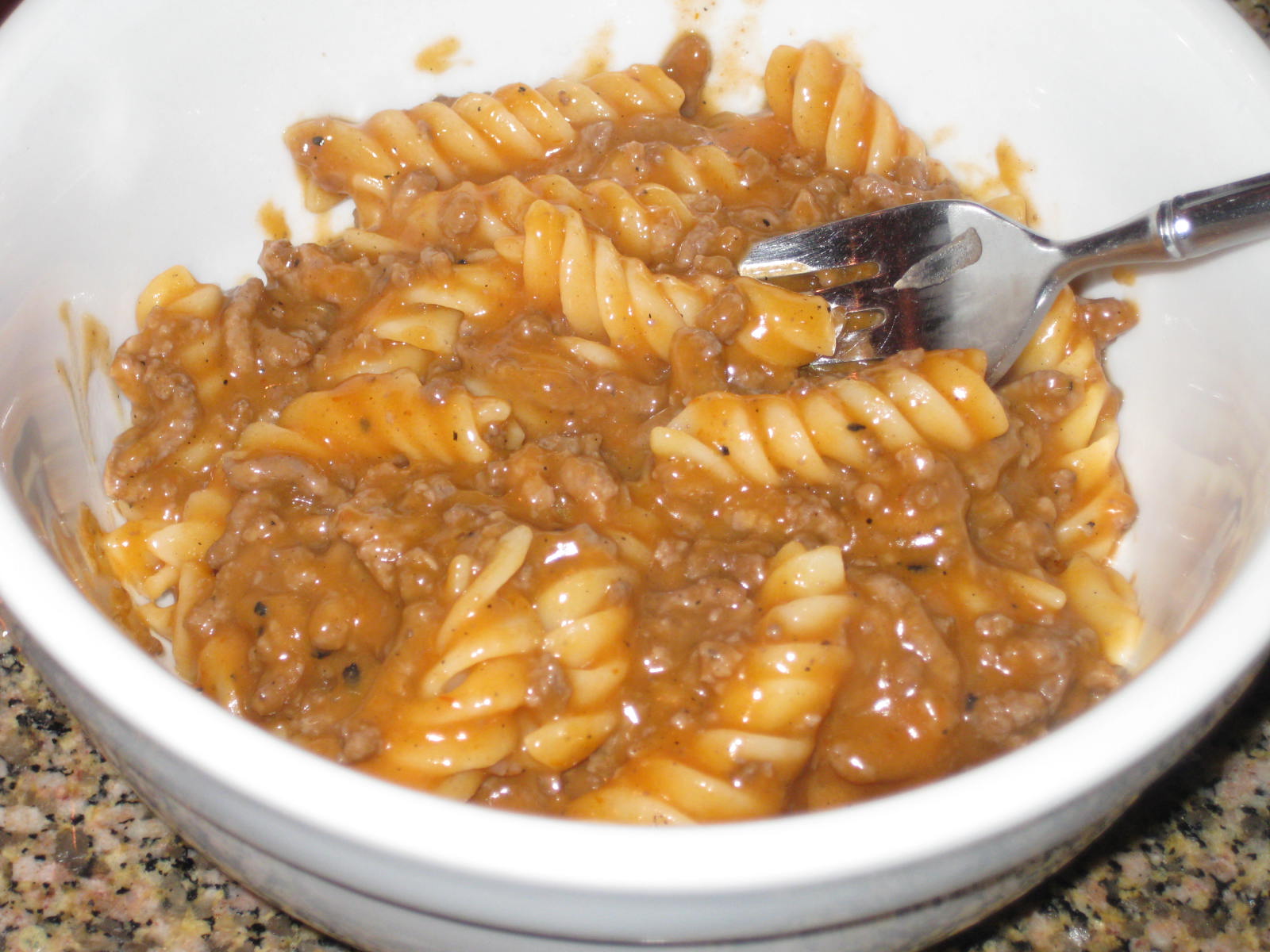 - Combine cooked pasta, beef, and soups in the skillet and cook until heated through.