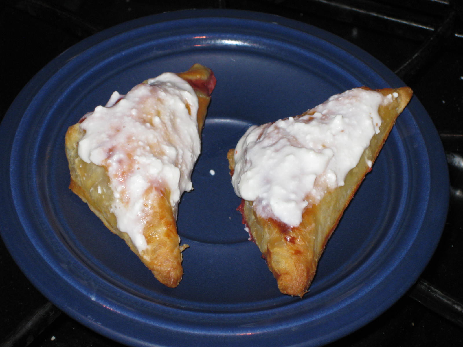 - Prepare glaze (Directions: Beat together the cream cheese and powdered sugar until blended. Add 1/2 tablespoons milk to thin). Brush the glaze over the slightly cooled turnovers.