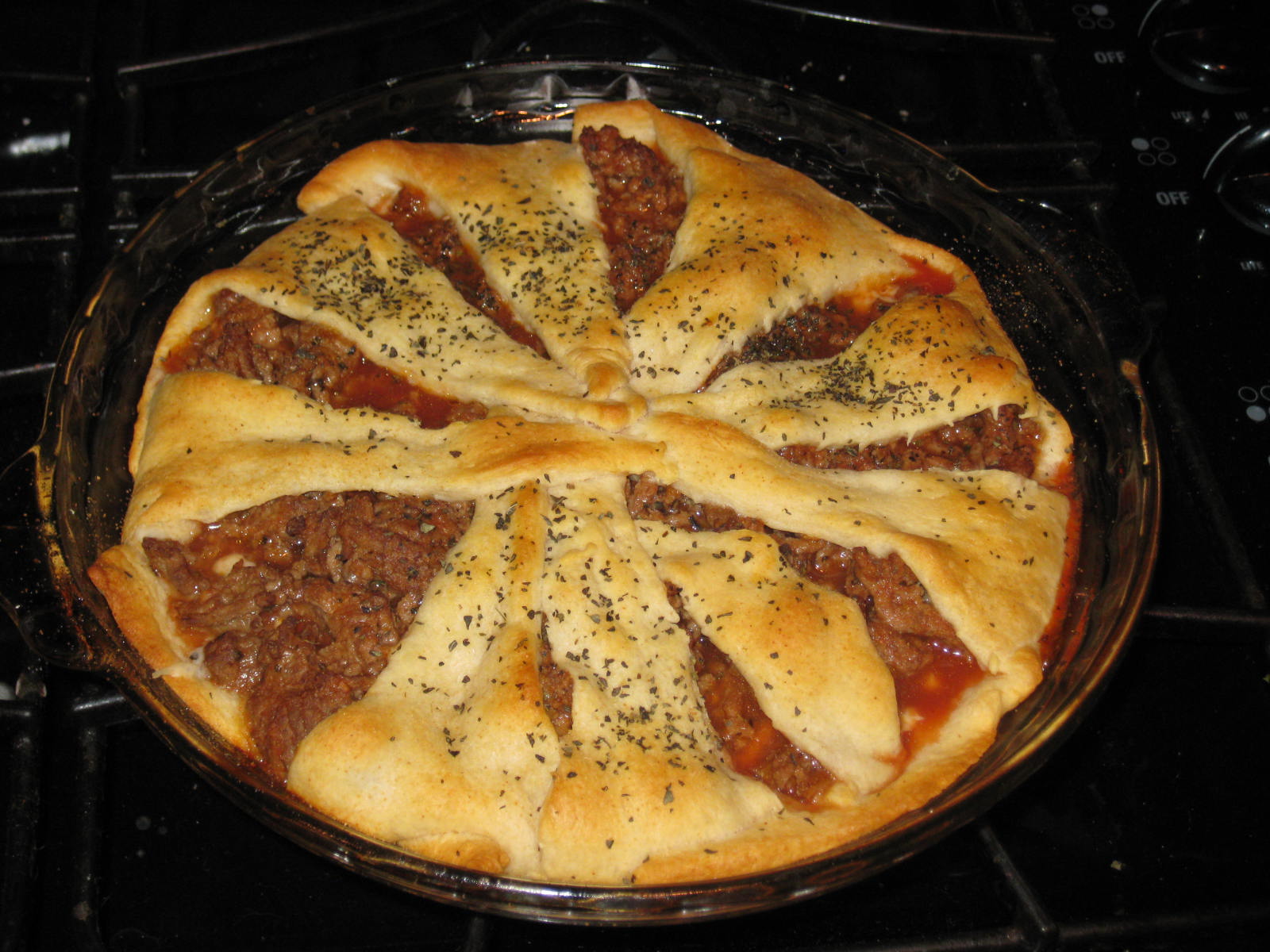 - Spoon meat mixture evenly over cheese. Bring tips of dough over filling to meet in center, overlapping slightly in the middle (It looks like spokes of a wheel! See picture below).