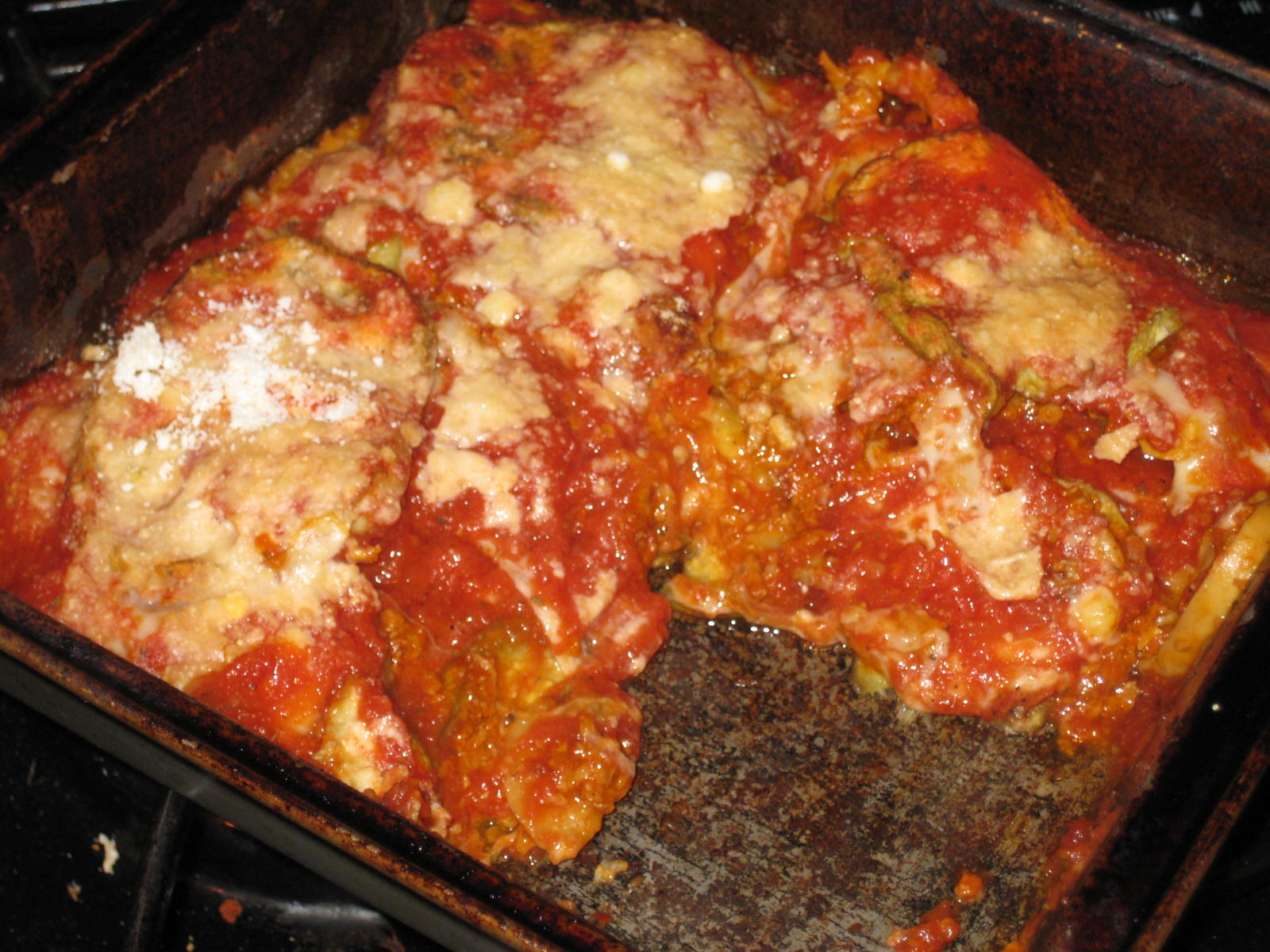 - Mist a 9×9 pan with cooking spray. To prepare lasagna layer in this order: about 1/4 of the marinara, half the eggplant slices, half the sausage mixture, 1.5 slice mozzarella, then repeat once more. Top it off with more marinara and then the parmesan cheese.