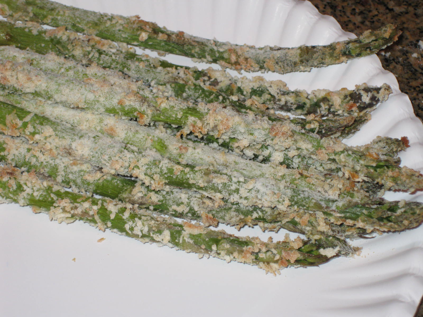 - Dredge the asparagus first in the egg and then in a mixture of parmesan, flour and bread crumbs. Place on a sprayed wire wrack placed atop a baking sheet.