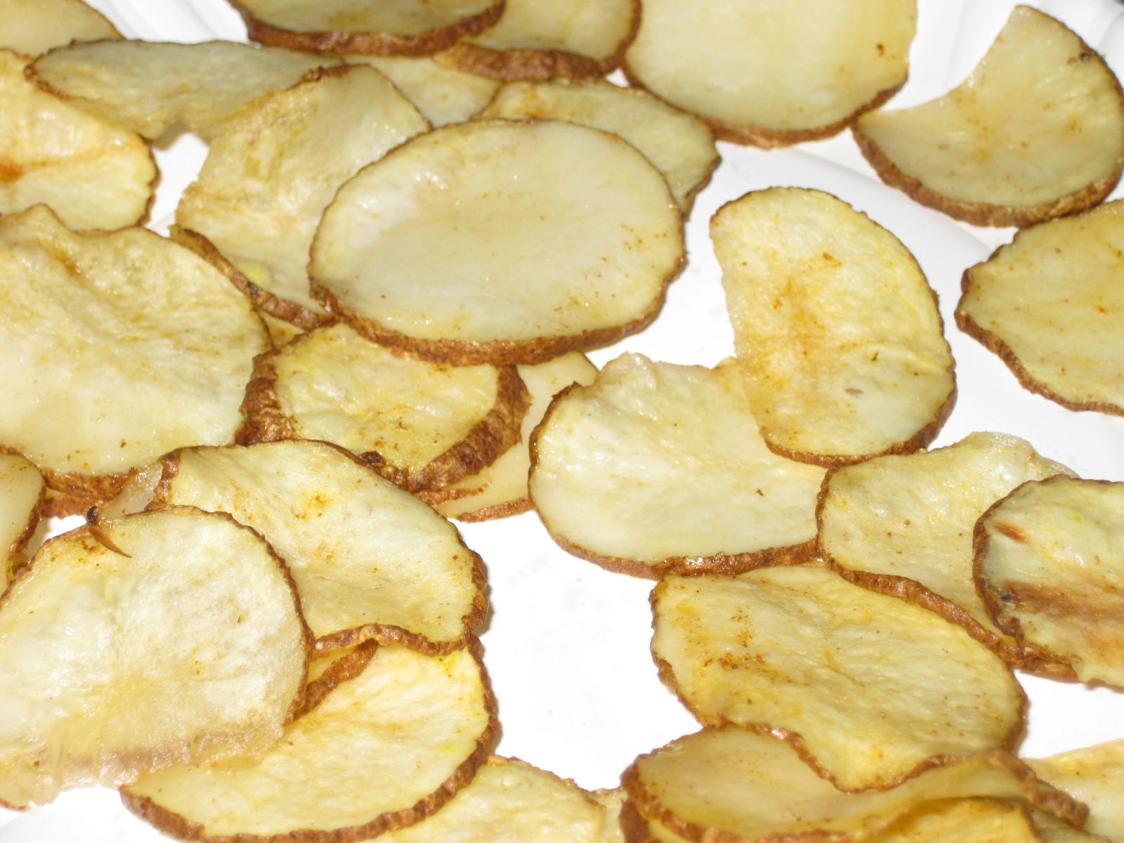 - Turn slices over (they will be hot, so take care with your fingers) and continue microwaving until they start to crisp and brown around the edges, about 35 seconds for very thin potato slices to 2 to 4 minutes for thicker slices. Check frequently and rearrange slices as needed to prevent scorching. Transfer chips to another plate and allow to cool completely. (They will crisp up more as they cool.)