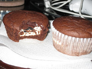 - Place a cookie dough chunk in the middle of each muffin cup, smoothing the cake batter over the top of each piece to enclose it.