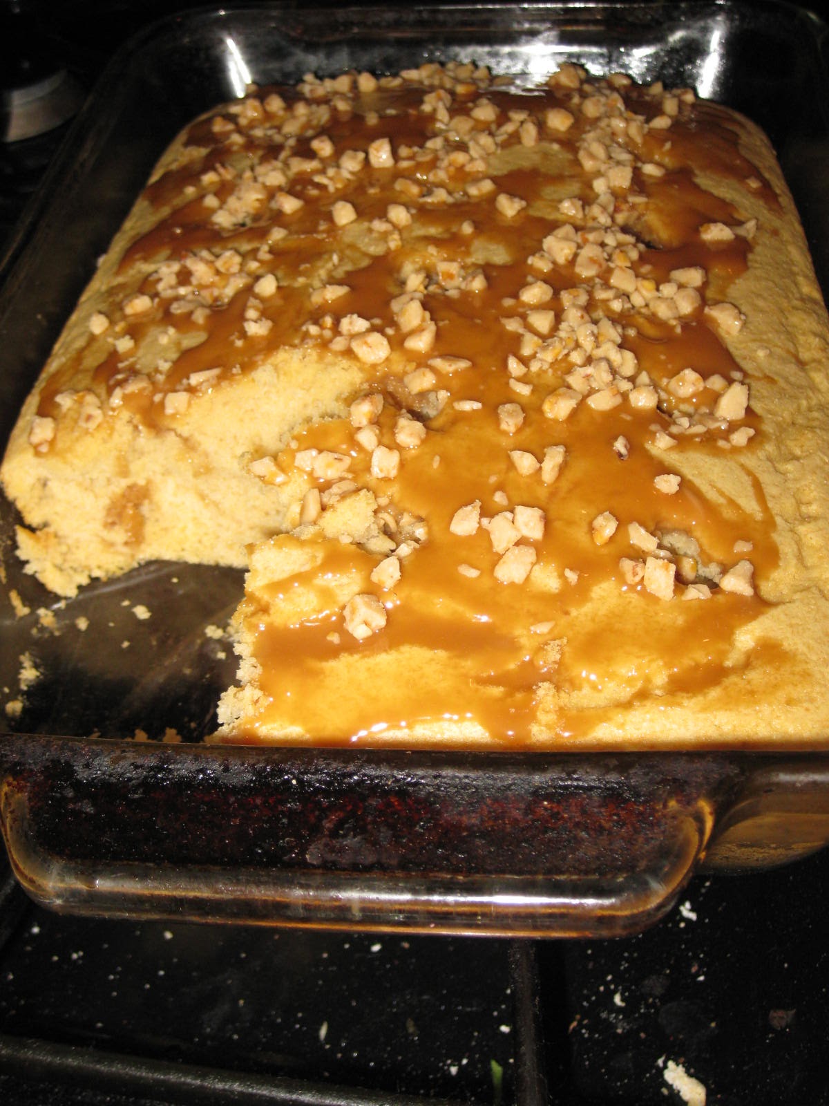 - Pour caramel by spoonfuls into the holes, and then spread the remaining topping in a thin layer (like a glaze) over the top of the cake.