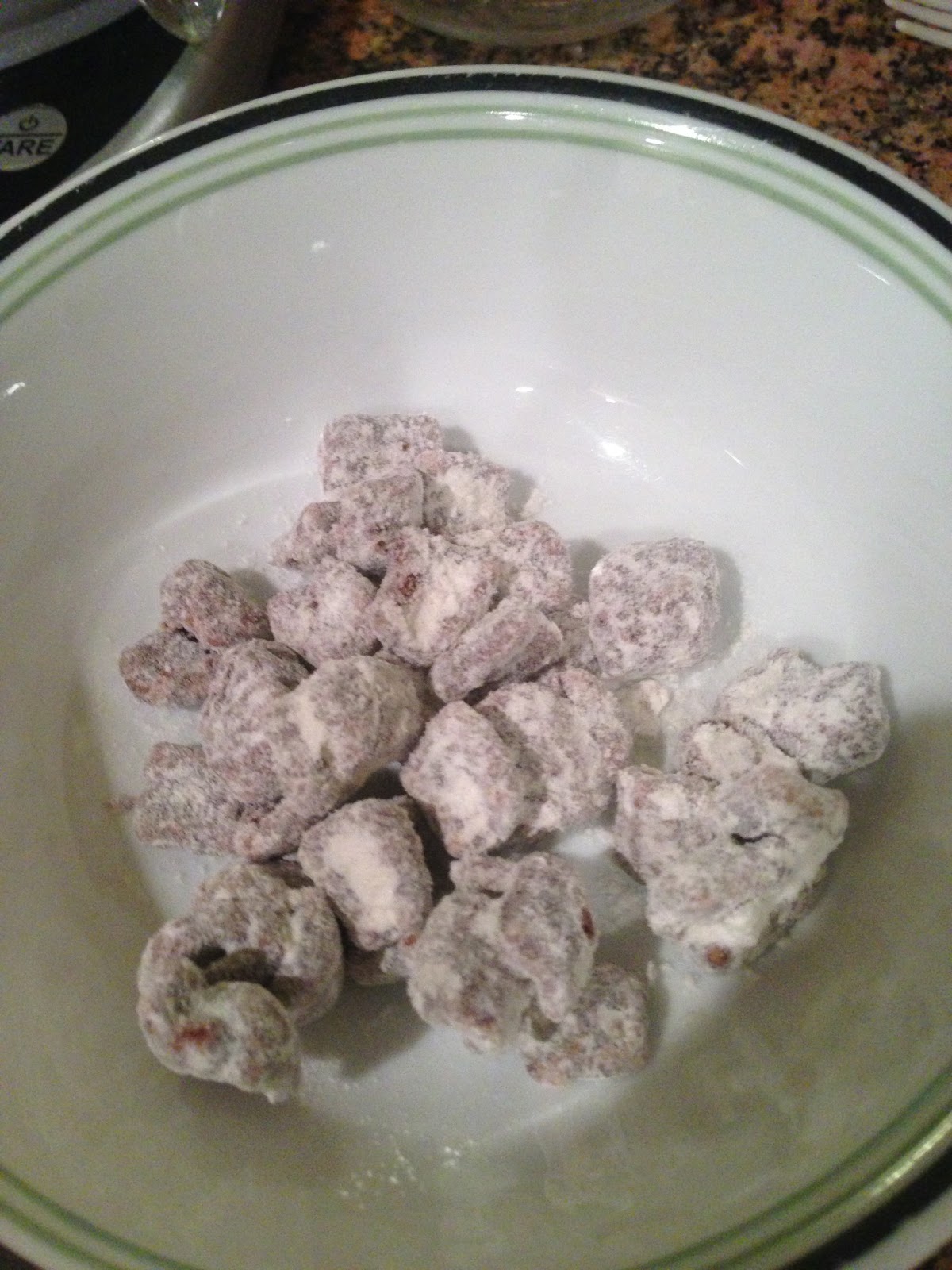 4. After the mixture has hardened pour it into a large ziplock bag, and add the box of pudding mix and shake gently. (This is where you can add the extra 2 Tbsp of powdered sugar to the bag, it just makes it a little sweeter).