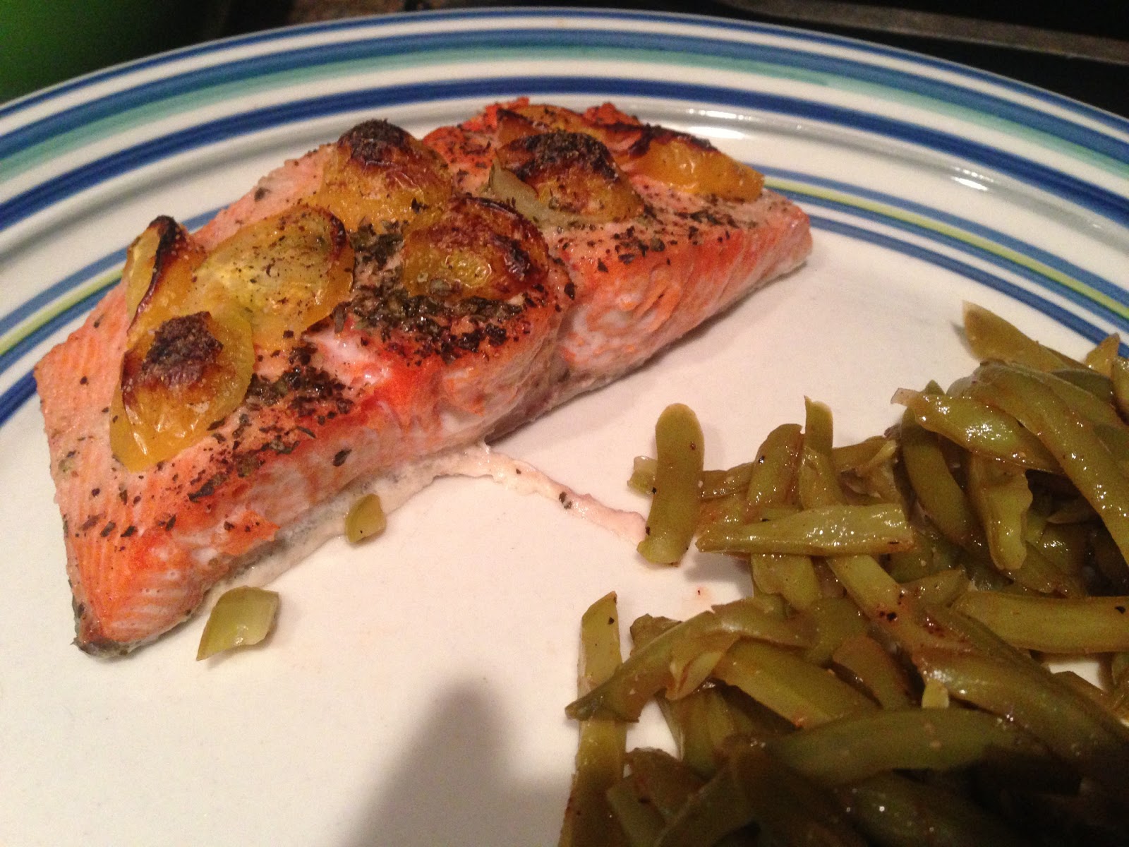 - Sprinkle garlic salt on salmon, then basil. Add sliced tomatoes and add salt and pepper. Mist with cooking spray.