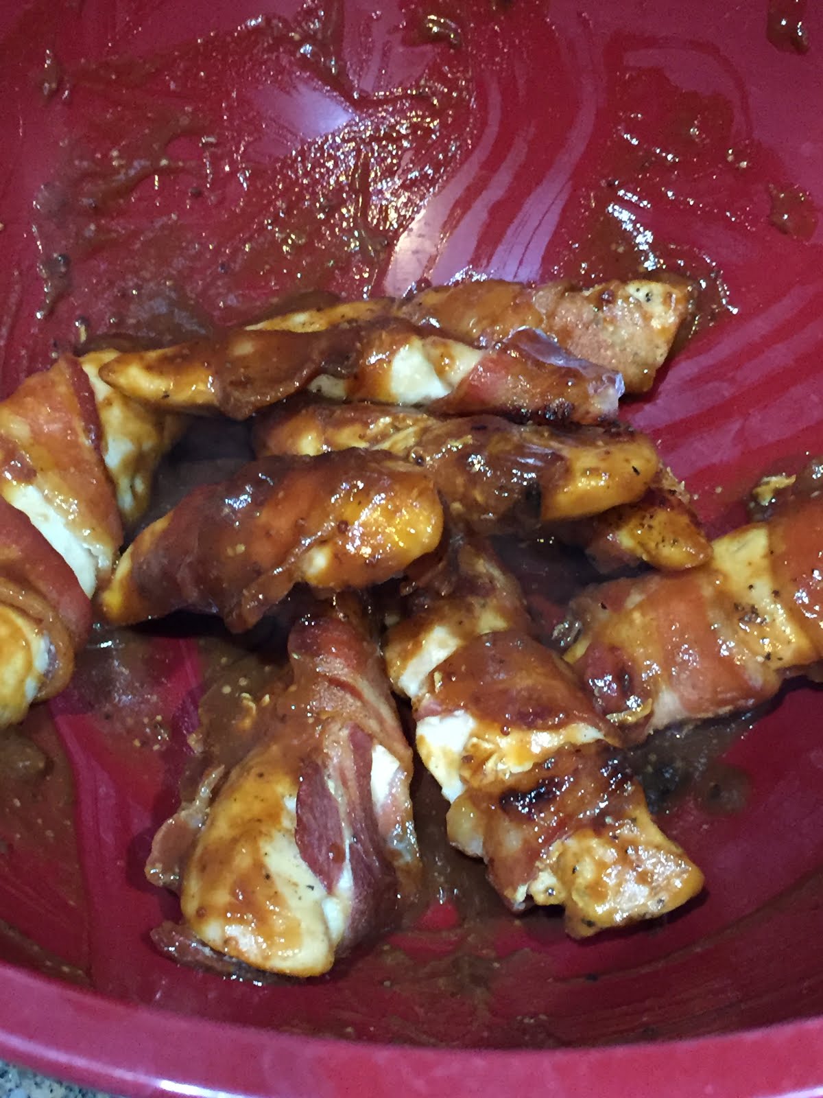 3. Place bacon-wrapped chicken pieces on cookie sheets, bacon end down. Bake for approx. 20 mins or until chicken is done (at least 165°F).
