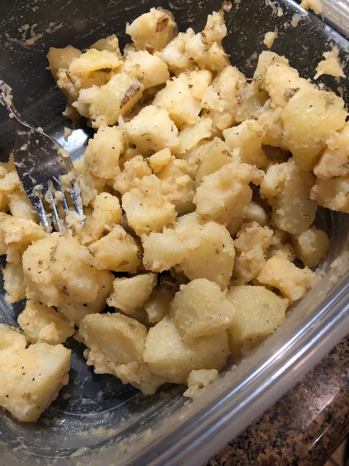 - Add the remaining ingredients while the potatoes are still warm and toss to coat.