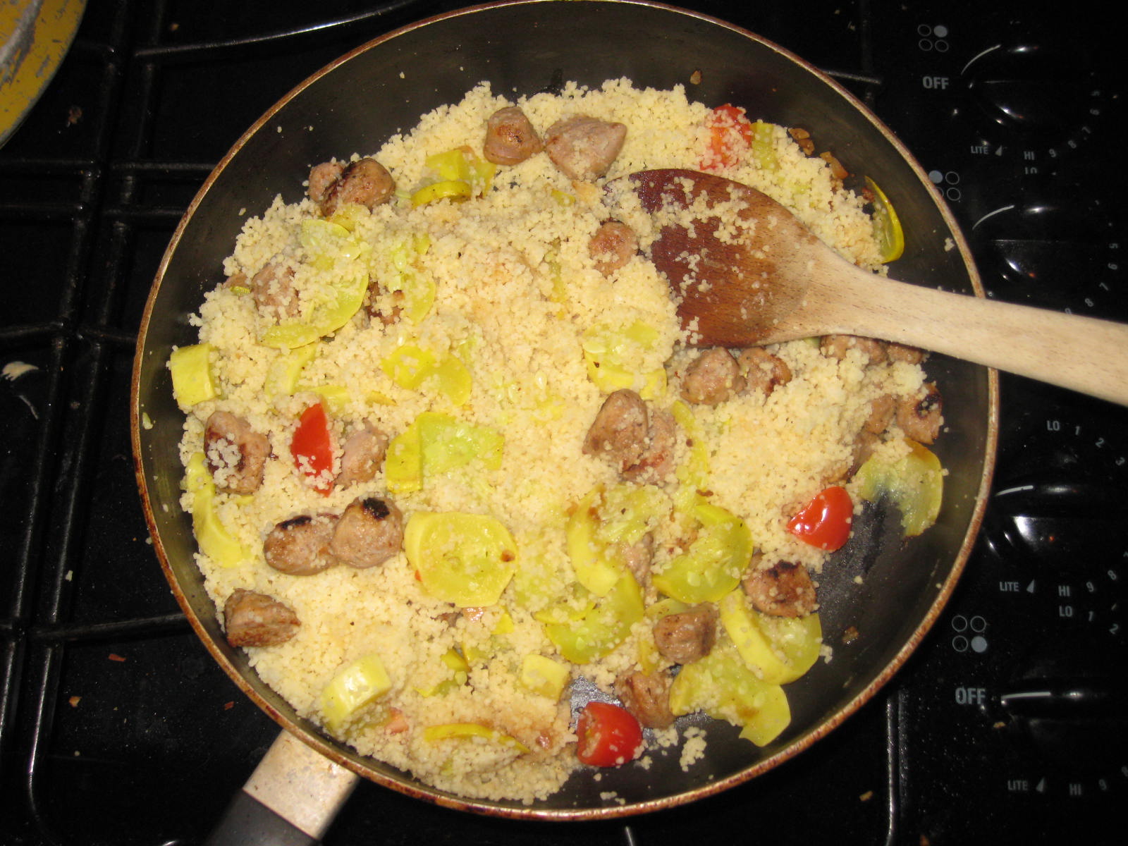 - Reduce to low heat and add spices, onions, and chives.
