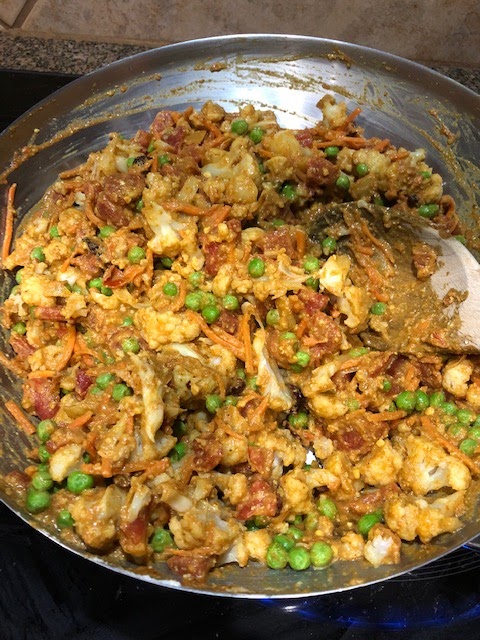 5. Add cooked vegetables, raisins, and cashew paste, mixing well. When the gravy comes to a boil, turn down the heat and simmer on a low flame for another 5 minutes for the flavors to incorporate. Garnish with cilantro.