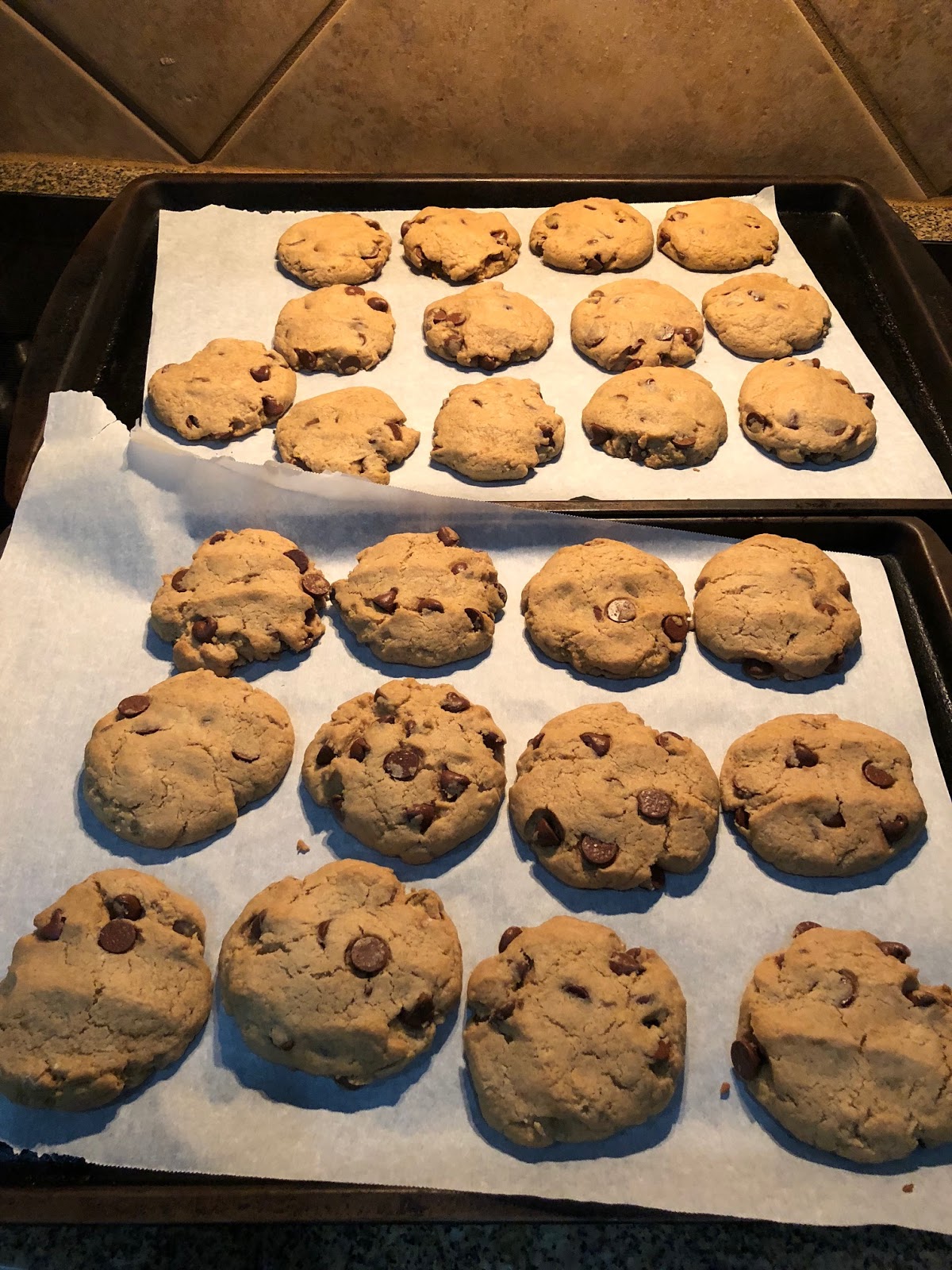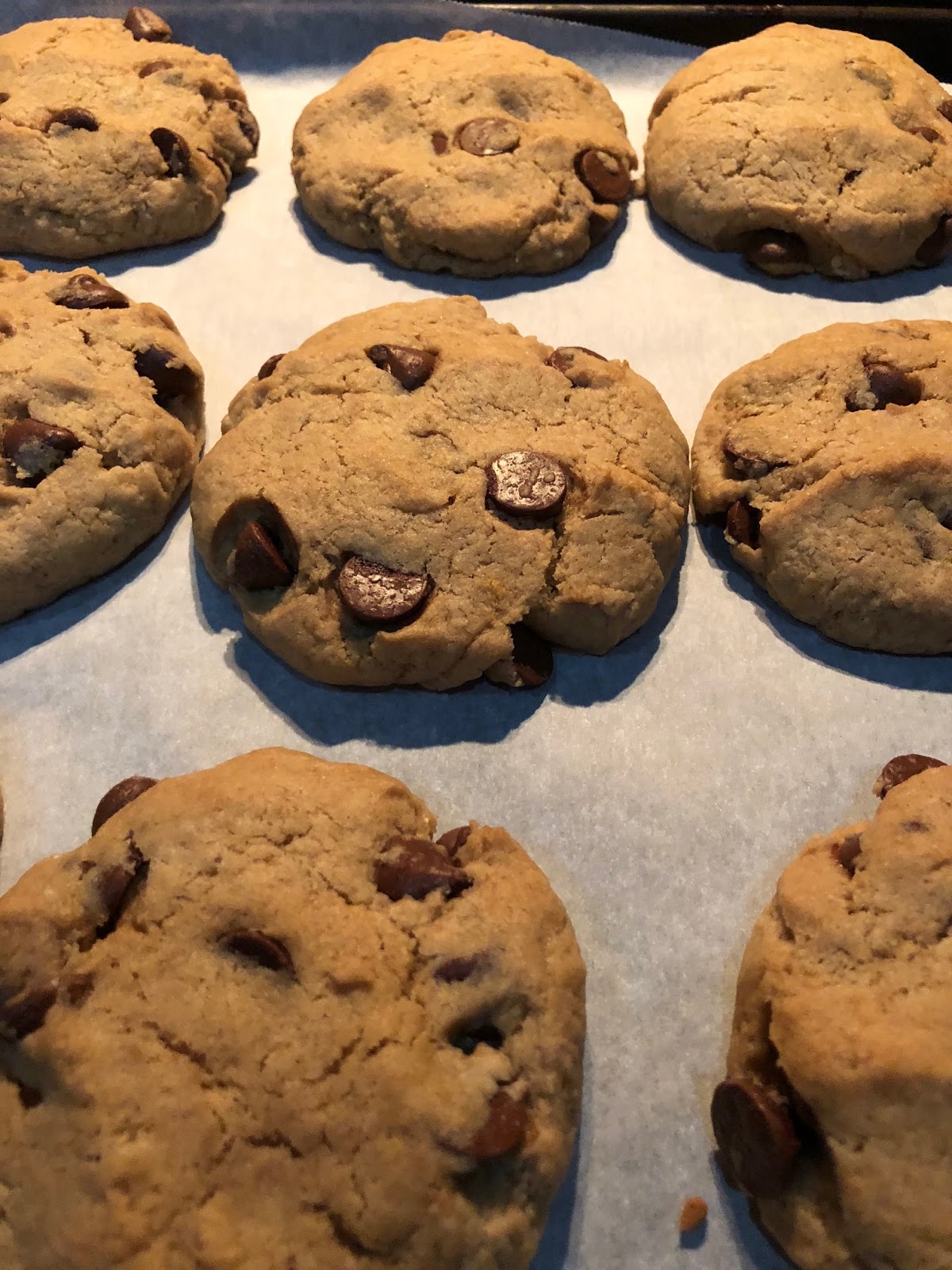 *Why I flattened the cookies: When I tried them in balls…they don’t flatten. They stay balls. So you have a crispy outside with a big cakey middle. When you flatten them…they look like cookies when they’re done, AND they cook more evenly like a cookie.
